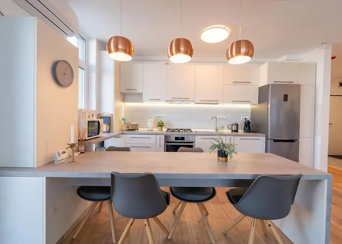 Modern Apollus Avenue - By Openhouse Apartments Timisoara, di 69 m², proporziona prossimità ad attrazioni turistiche come il Parco della Cattedrale, che si trova a soli 6 minuti a piedi. Il Wi-Fi e il parcheggio privato gratuito sono a disposizione degli ospiti per le loro esigenze di lavoro o di svago.